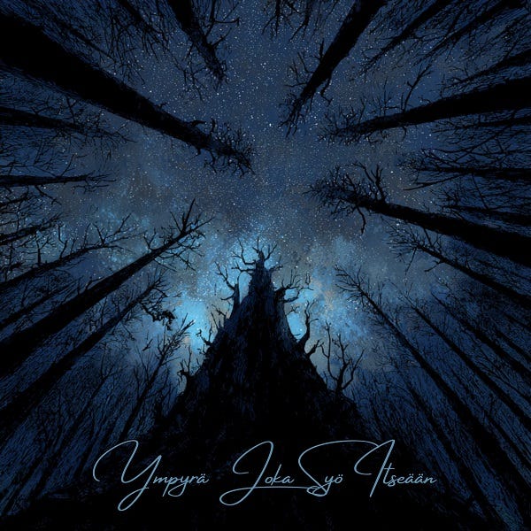 "Ympyrä Joka Syö Itseään" is a black metal descent into the sacred void, where silence turns inward, where gods remain unnamed, and where birth itself is only death in disguise. This is the sound of a frozen serpent devouring itself in slow ritual. This is hunger eternal. This is the forest that swallows all."